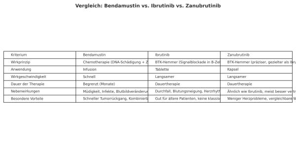 Bendamustin: Wirkt relativ schnell, oft schon nach dem ersten Zyklus messbar. Ibrutinib/Zanubrutinib: Wirken kontinuierlich und brauchen manchmal Wochen bis Monate, um die volle Wirkung zu entfalten.