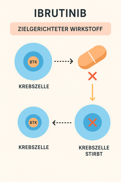 Ibrutinib ist so etwas wie ein „Schalterblockierer“ für Krebszellen: Es nimmt ihnen die Signale, die sie zum Wachsen und Überleben brauchen. Dadurch wird die Krankheit zwar oft nicht geheilt, aber sie kann lange gestoppt oder stark verlangsamt werden – oft bei guter Lebensqualität.